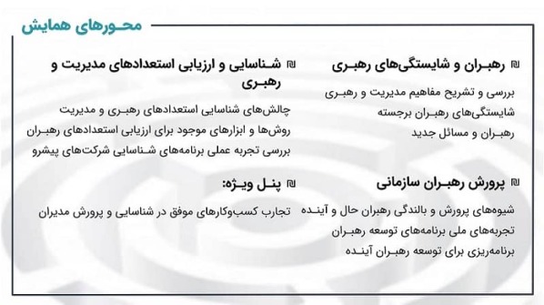 در این همایش موضوعات نسبتا جامعی درباره مفاهیم رهبری، تعریف رهبر و مدیر، ارزیابی و شناسایی رهبران، روشهای توسعه رهبران، ابزارهای شناسایی استعدادهای رهبری، چالشهای ارزیابی و توسعه رهبران و معرفی نمونه هایی از تجارب شرکتهای موفق ایرانی در مسائل رهبری ارائه خواهدشد.